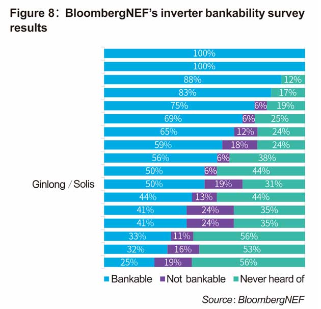 BloombergNEF’s survey asked banks, developers and technical due diligence firms which brands, out of 48 module manufacturers and 17 inverter manufacturers, they considered bankable.