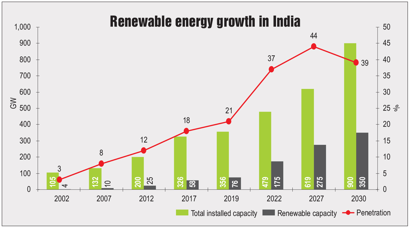 The penetration of renewable energy in the grid has improved in the past few years and is expected to increase further over the coming years. Currently, the level of penetration stands at around 21 per cent in terms of capacity, with over 80 GW of renewables installed so far. Renewable energy generation capacity is expected to grow at a compound annual growth rate of around 14.9 per cent per annum during the 2019-30 period provided the target of 175 GW by 2022 is attained. Due to high penetration of solar energy, the grid is expected to witness high ramp-down and ramp-up requirements. If renewable energy penetration is around 30 per cent, the level of required balancing reserves will be 48-50 GW. In the 2022 renewable energy scenario, the total balancing reserves required during the evening ramp are expected to be 60 GW. Thus, synchronisation between different energy sources will be needed to maintain grid stability. Greater flexibility and controllability will be required in such situations. Therefore, the need for balancing reserves will also arise to enable quick discharge and storage.