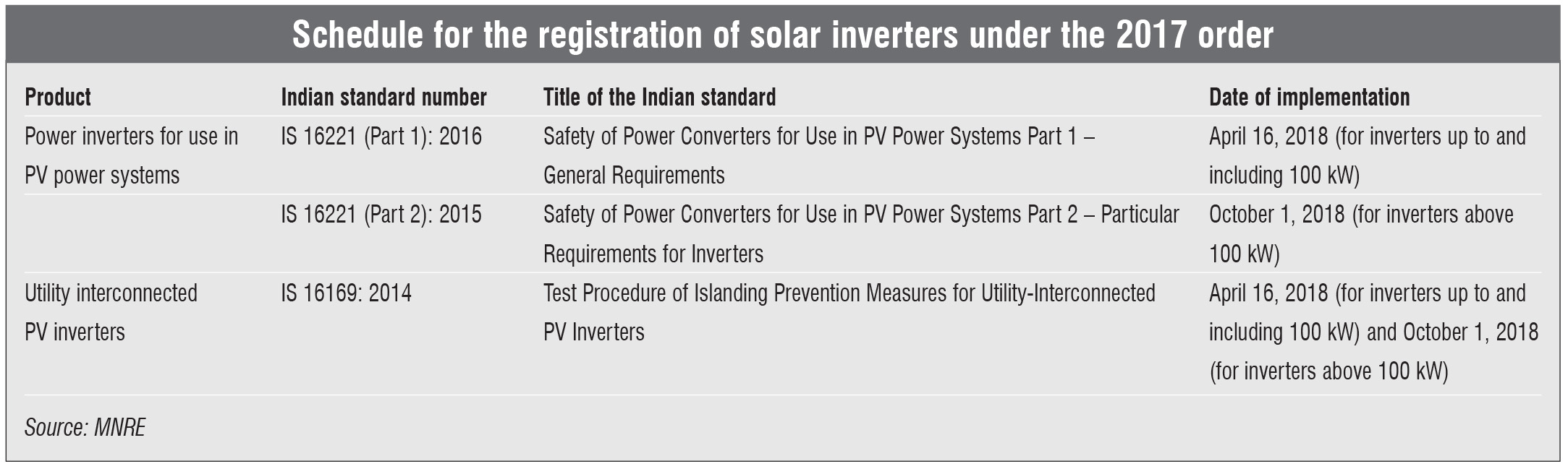 The new guidelines are applicable to all solar PV-based off-grid, grid-connected and hybrid inverters of capacities up to 150 kW. As per the new guidelines, there are several inverters of the same size, rating and type, and these can be grouped together for submitting samples to testing labs. The product family will be granted approval based on testing of one model. All models that have similar hardware and software credentials are included in a single product family.