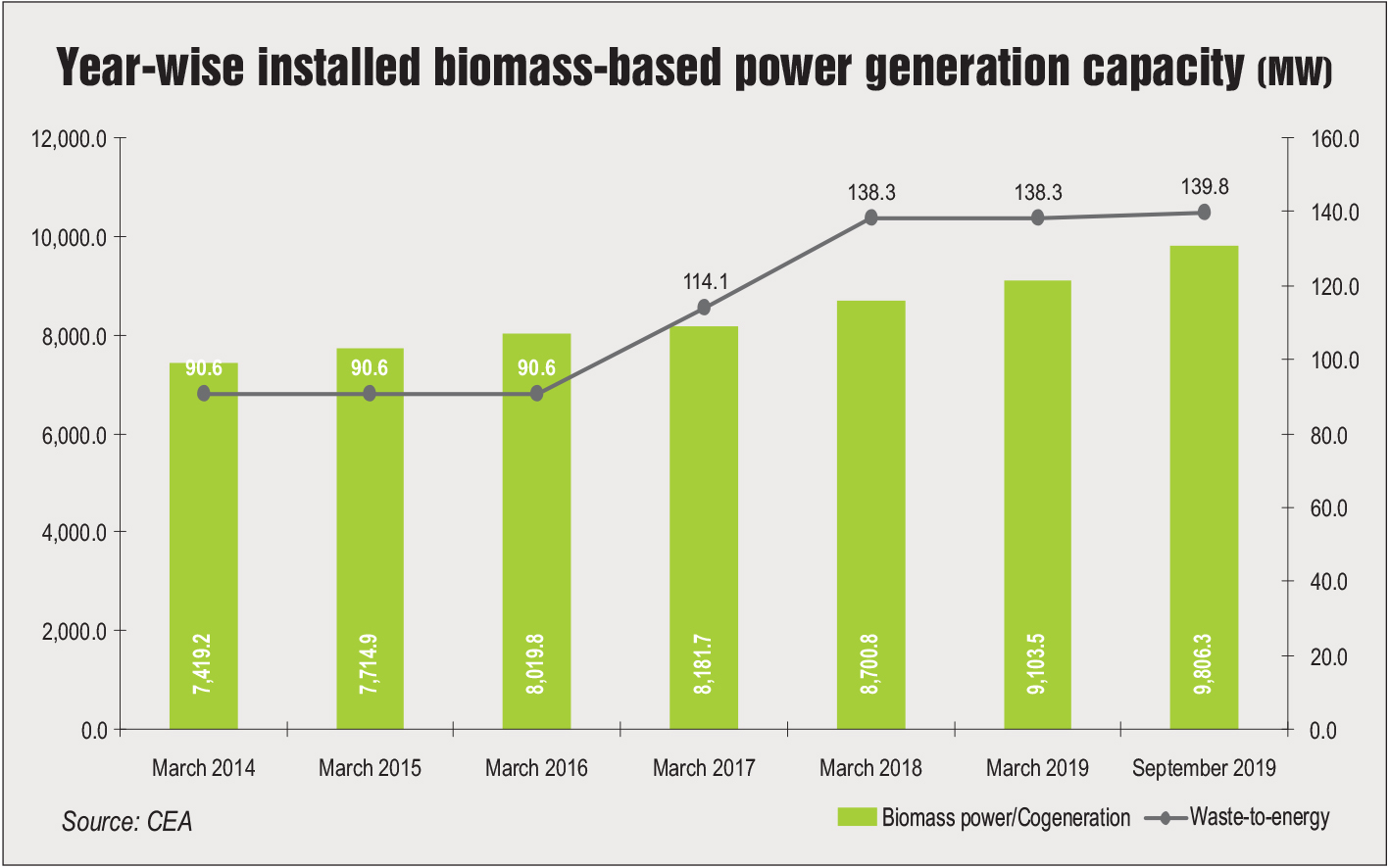 India has set a target of achieving 10 GW of biopower-based installed capacity by the year 2022. The progress on this front has been good with 99 per cent of the target having already been achieved in September 2019. The current installed biopower generation capacity stands at 9,946.1 MW. The main driver of this growth has been biomass cogeneration.