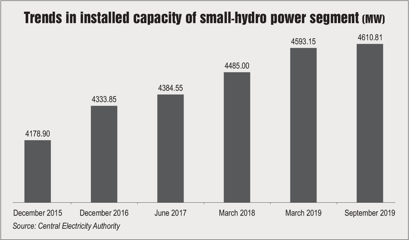 Growth in the small-hydro power (SHP) segment remained sluggish. While the government remains fairly optimistic about the segment, there has not been any substantial increase in the installed capacity. The industry remains underdeveloped with an installed base of only 4,610.8 MW as of September 2019, against an estimated potential of 20,000 MW across 6,474 sites. The total generation from SHP plants in 2018-19 stood at 8,236.36 MUs, up from 7,314.73 MUs recorded in 2017-18.