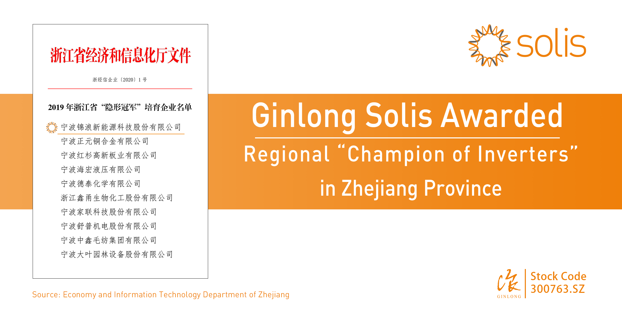 Ginlong Solis has been recognized as a “Hidden Champion” award winner by the regional Zhejiang Provincial Economic and Information Commission. To be named to the agency’s prestigious list of companies that are making an economic and social impact within the region, Ginlong had to undergo a thorough vetting process by multiple entities, including the economic and information departments from both the city and the province.