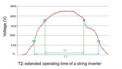 As the PV string MPPT features a wide operating voltage range, this in turn enables a longer operating time for the solar inverters, extending the power generation time, and further improving the overall efficiency of the power plant.