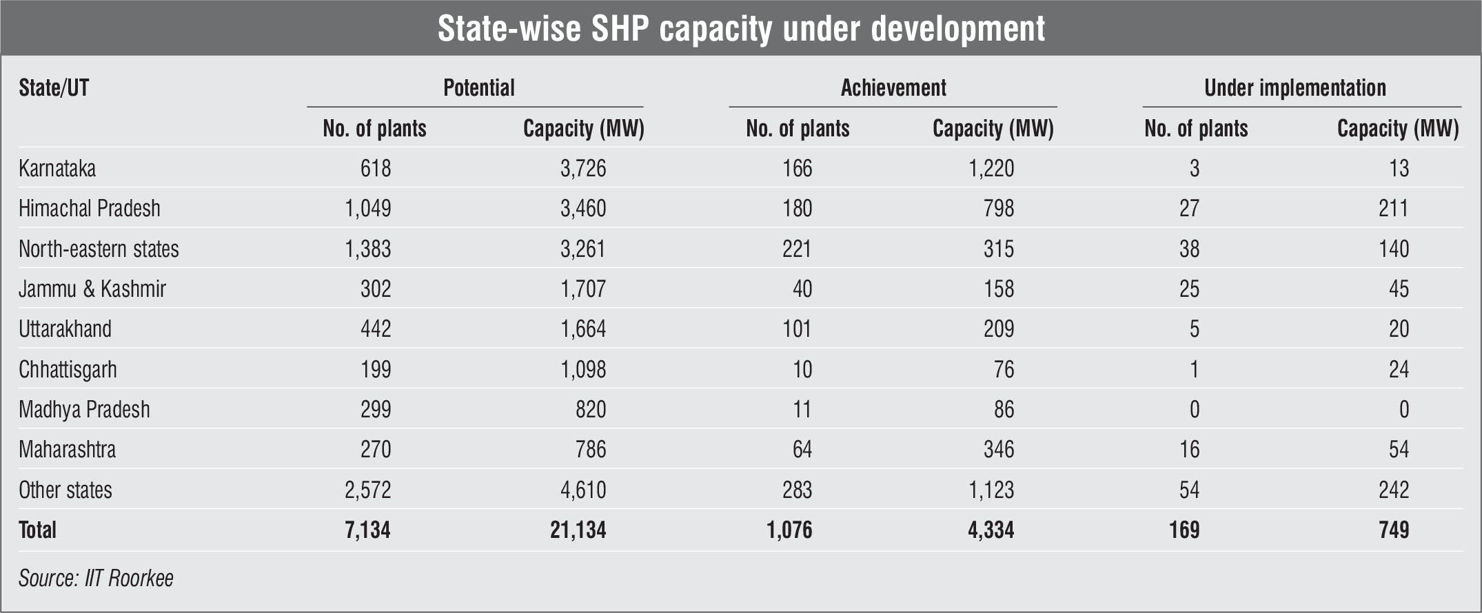 Himachal Pradesh has the second largest potential of 3.4 GW in the SHP segment. However, the installed capacity is relatively lower than Karnataka vs at just about 800 MW. Apart from this, around 211 MW of capacity across 27 SHP plants is in the pipeline. The north-eastern region has an SHP potential of over 3 GW, but the installed capacity is only about 10 per cent, or 315 MW. Another 140 MW is at various stages of development.