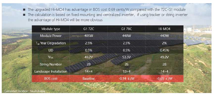 With a 72 cell module with a 158.75mm silicon wafer, at a power station adopting a centralized inverter and fixed bracket configuration, the BOS cost of the Hi-MO 4 can be reduced by 0.65 US cents/W. Although the power of a 78 cell module is equal to that of the Hi-MO 4, the reduction in the number of series connections leads to a significant gap between the cost saving of its BOS and that of Hi-MO 4.