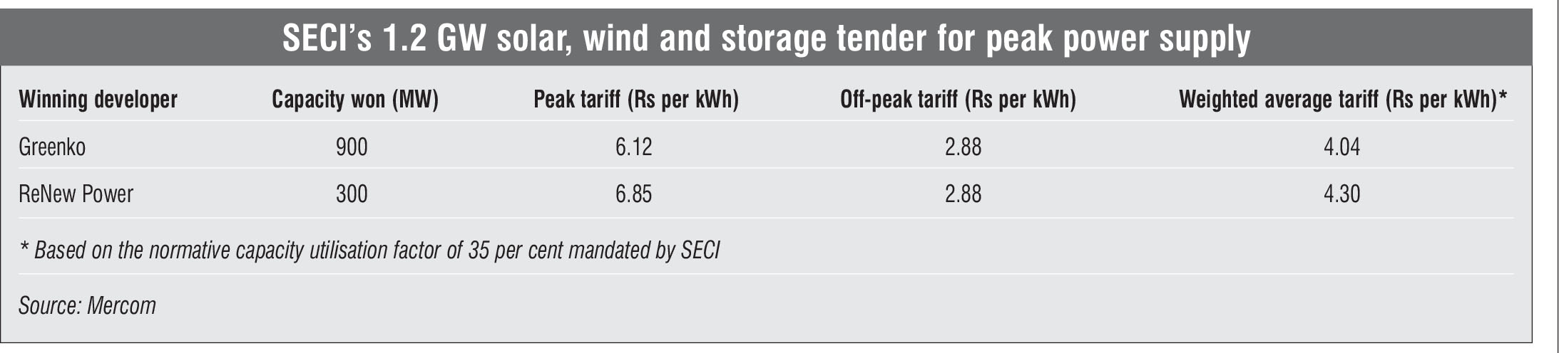 The procurement round was oversubscribed, with bids received for 1.62 GW of capacity. Among the winners, Greenko secured 900 MW of pumped storage capacity with the most competitive tariff bid. The company offered a weighted average tariff of Rs 4.04 per kWh and a quoted peak tariff of Rs 6.12 per kWh. The second winner, ReNew Power, secured the remaining 300 MW of capacity with a weighted average bid of Rs 4.30 per kWh and a quoted peak price of Rs 6.85 per kWh. These tariffs mark a world record for renewables-plus-battery storage capacity. The weighted average is based on the normative capacity utilisation factor of 35 per cent mandated by SECI. For renewable energy supplied during off-peak hours, SECI will pay a pre-specified tariff of Rs 2.88 per kWh. The tariffs are applicable for a period of 25 years.