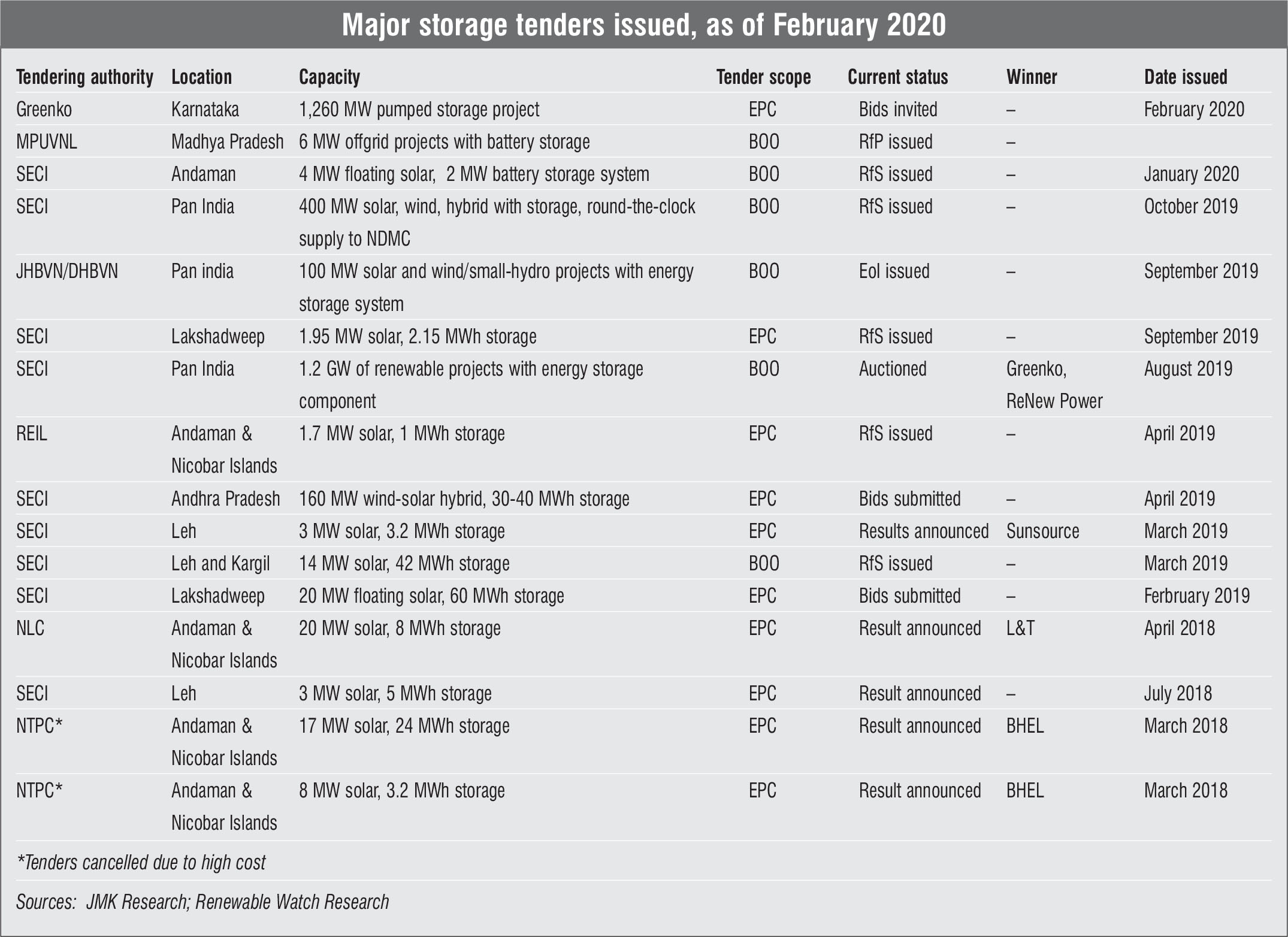 Apart from various policy measures, there has been an increase in storage tenders released by SECI, NTPC, Rajasthan Electronics & Instruments Limited, NLC, Uttar Haryana Bijli Vitran Nigam and Dakshin Haryana Bijli Vitran Nigam during 2019. However, the design of many of these tenders is making project implementation unsustainable. In most of these tenders, the storage capacity is so high that it leads to infeasible solar+storage tariffs and eventually, to the cancellation of many tenders. It is hoped that as the market matures over time, these operational and execution challenges will get addressed