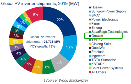 In 2019, global PV inverter shipments increased by 18% on a YOY basis with total shipments reaching 126,735 MW according to the report released by Wood Mackenzie. Growatt shipped a total capacity of over 5GW for the year and ranked No.8 among the inverter suppliers. The company has been pursuing a global strategy of localization in recent years and has gained strong growth momentum across the world.