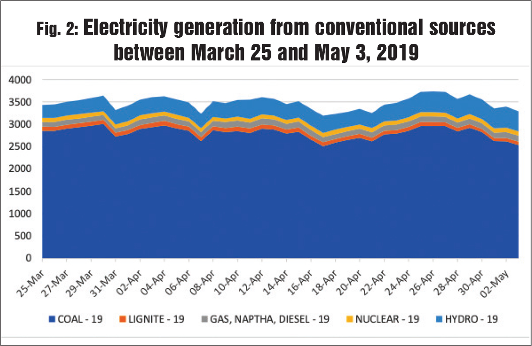 Figs. 2 and 3 present the electricity generation from conventional sources from March 25 to May 3, 2019 and the same period in 2020 respectively. The conventional sources considered here are coal, lignite, gas, naphtha and diesel, nuclear and hydropower. The cumulative electricity generation in those 40 days in 2019 was 139,346 MUs and it has reduced to 102,501 MUs in 2020, showing a reduction of 26 per cent.