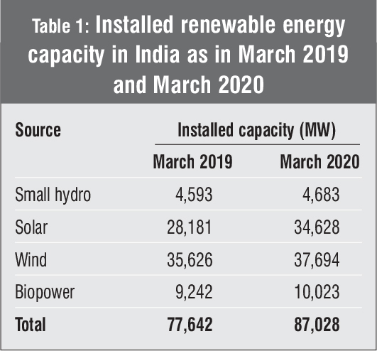 To answer this question, we will look into the installed capacity of different renewable energy sources in 2019 and 2020. Table 1 presents the all-India installed renewable energy capacity as on March 31, 2019 and March 31, 2020. With respect to renewable energy sources, the installed solar energy capacity has increased very significantly from 28,181 MW to 34,628 MW, followed by wind energy from 35,626 MW to 37,694 MW.