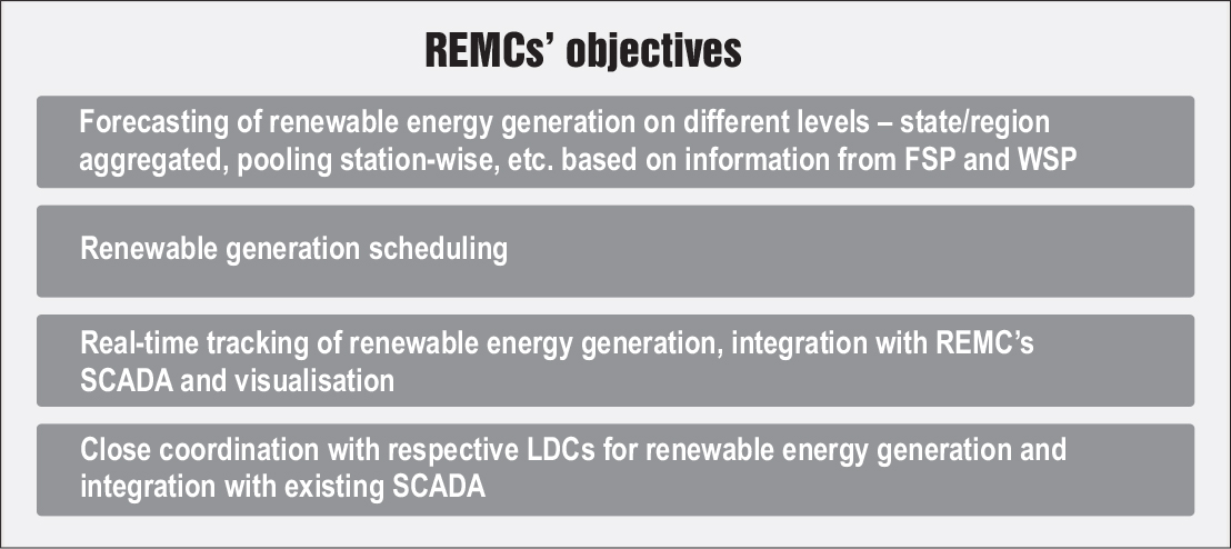 The REMCs are equipped with artificial intelligence-based renewable energy forecasting and scheduling tools, which provide better visualisation and situational awareness to grid operators. REMCs coordinate with the respective state load despatchcentres (SLDCs) and are integrated with existing SCADA for the despatch of renewable generation.