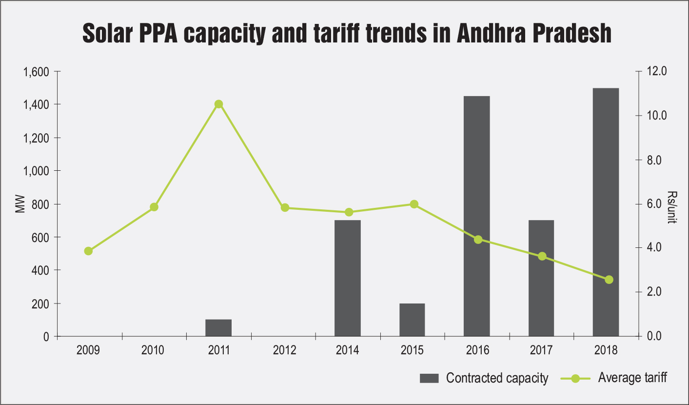 Andhra Pradesh has been a forerunner in the adoption of non-conventional energy sources. As per the Andhra Pradesh Electricity Regulatory Commission’s tariff order for 2019-20, non-conventional sources accounted for 24.5 per cent of the total energy. This is much higher than the renewable purchase obligation (RPO) of the state. The total capacity of wind and solar PPAs in the state stands at about 8,500 MW, of which almost 5,950 MW of capacity generates power at above Rs 4 per unit. The falling tariffs of solar power procurement have started a debate on whether the developers who had signed past PPAs were receiving undue gains at the expense of the state exchequer. This has led to the state evaluating PPA renegotiations, which has further opened up a Pandora’s box of problems.