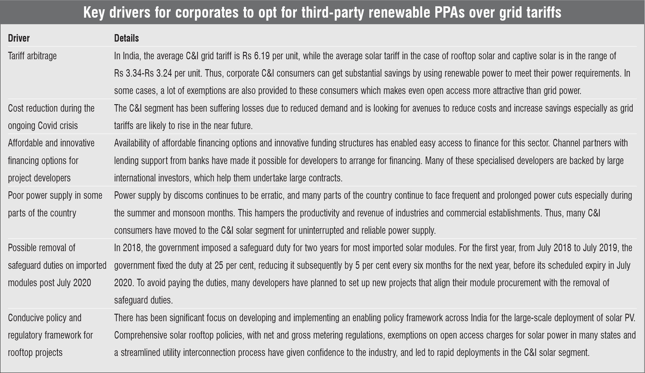 The Covid-19 outbreak has further strengthened the case for corporate PPAs, expanding the potential for this market. The C&I segment, which has been suffering losses due to reduced demand, is looking for avenues to reduce costs, and energy cost reduction will significantly help increase savings for any individual or business. In India, companies can source renewable electricity at a 15-40 per cent discount on industrial electricity grid tariffs, which translates into major cost savings. As a result, this financial year, in spite of the coronavirus outbreak, there is a strong potential to add around 1 GW of corporate PPA projects in India.