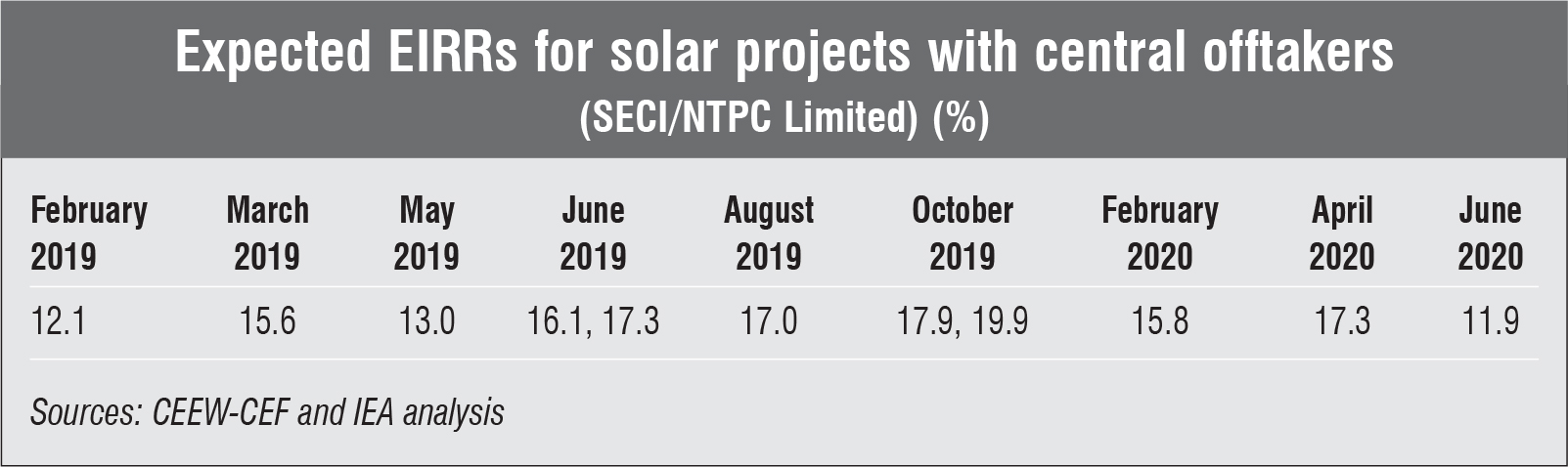 According to the report, the expected EIRR of solar projects was 15.2 per cent in 2019 and 15.3 per cent in 2020 (estimated on a capacity-weighted average basis). These numbers are around 1.4 times lower than the cost of debt financing (10.5-11.2 per cent) during the period. All else being equal, the tenders that faced less competition were associated with higher EIRRs while those that faced greater competition were associated with lower EIRRs.