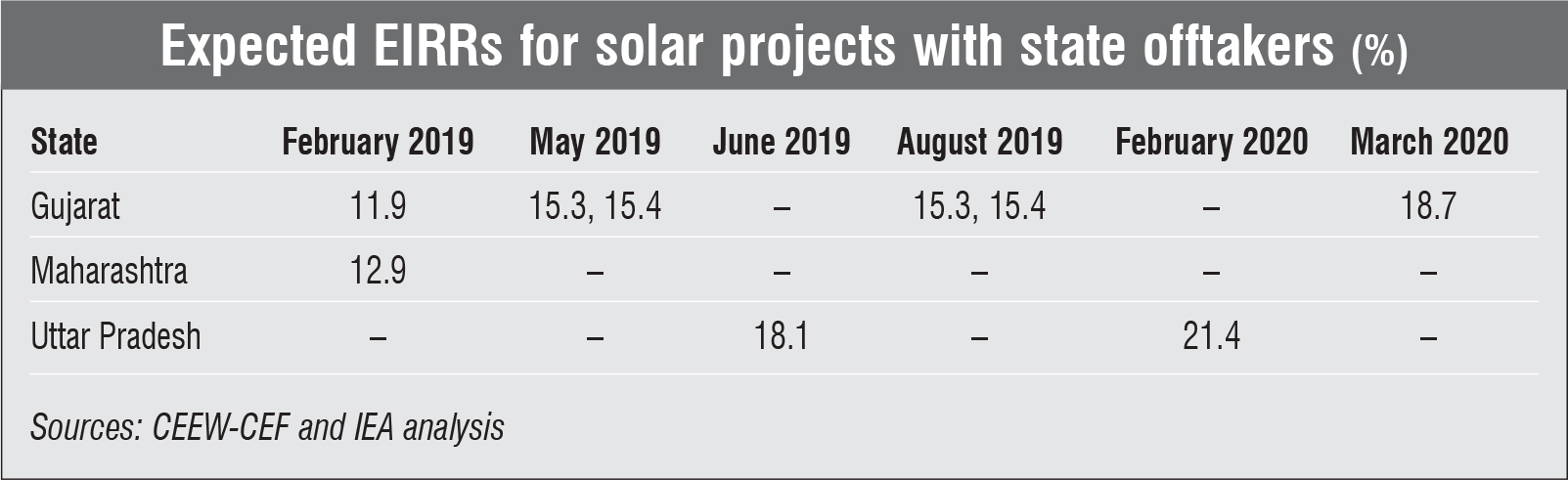 Overall, projects with central and Gujarat discoms as offtakers had the lowest EIRRs, and less creditworthy states were associated with higher EIRR expectations. Moreover, according to the report’s methodology, projects to be installed in solar parks had lower EIRR expectations, due to limited land acquisition and transmission risks associated with them.