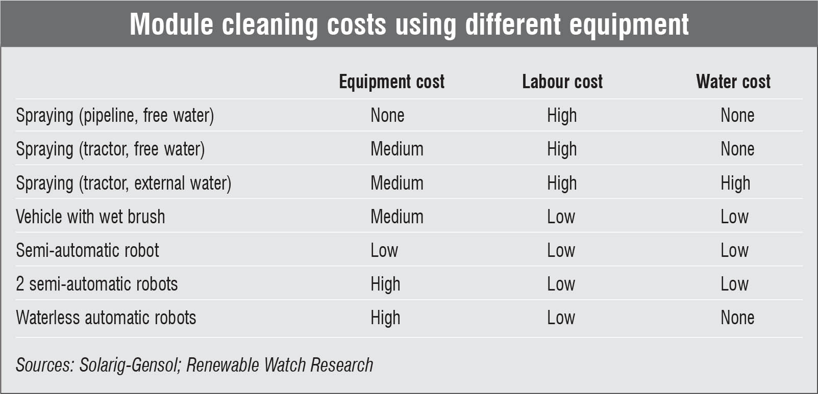 The frequency of module cleaning and the technique used often depend on the project site. For instance, modules at sites located close to mines have to be cleaned at least once a week, while those in regions that receive regular rainfall can be cleaned just once or twice a month. Although water consumption levels in solar plants are over 20 times lower than in thermal power plants, the volumes are still phenomenal, adding to operating costs. In many arid and semi-arid regions especially, water is a very costly resource because of which plant operators are forced to reduce the frequency of module cleaning. This affects project returns substantially. Thus, there is a need to have water lines in place prior to the commissioning of a plant. In projects where surface water is unavailable, groundwater from borewells is often used for module cleaning.