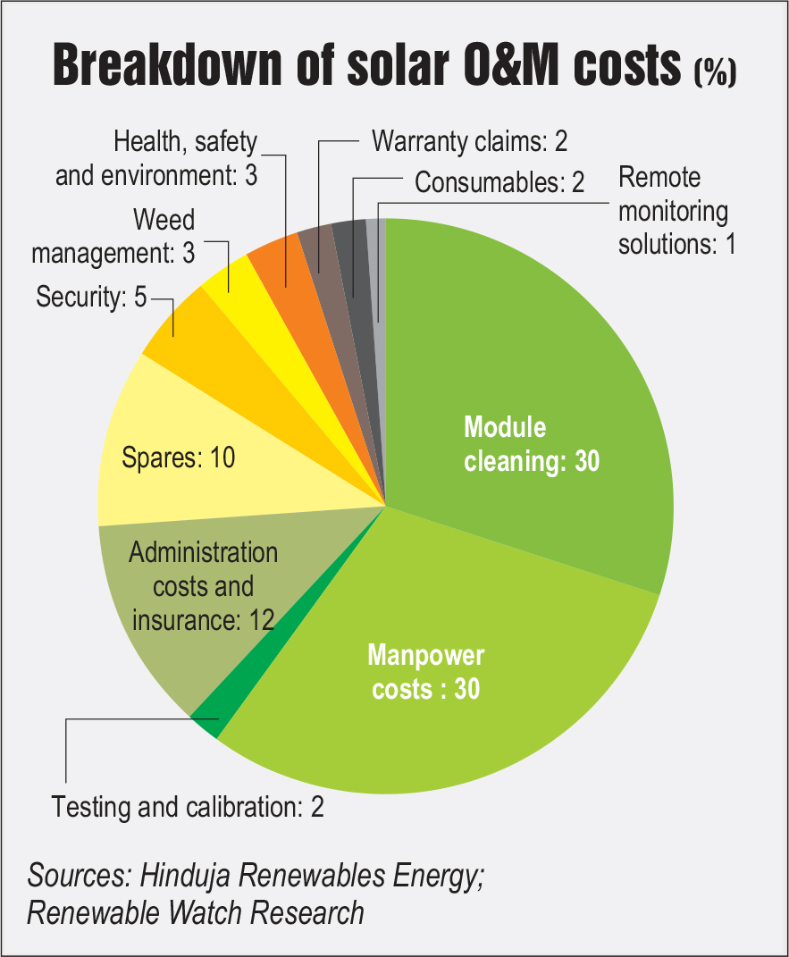 In the Indian scenario, where most large projects are located in the dry and sandy regions of Rajasthan, Gujarat and Madhya Pradesh, dust deposition is a major cause of performance loss in solar panels, necessitating regular cleaning. Even in other parts of the country, high levels of pollutants and dust coat the solar panels, impacting performance. When rain or dew combine with this fine dust, it becomes even harder to clean the panels. In the mountains, too, snow or ice can accumulate on the solar panels, impacting performance. In fact, according to studies, dirty solar panels can reduce solar plant efficiency by more than 30 per cent and in arid regions, losses due to soiling can reach up to 25 per cent through just seasonal rain and dust. Hence, module cleaning is an important O&M activity, contributing to nearly 30 per cent of total O&M costs depending on the quantity of water utilised, equipment used and manpower employed.