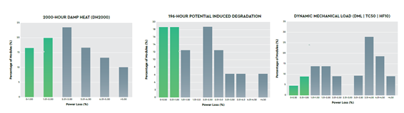 To characterize reliability, the report presents performance distribution data based on a series of tests, including DH2000,HF30,TC600, DML, UV and PID196h. For the performance category, it presents data characterizing module conversion efficiency, PVUSA Test Conditions (PTC) ratings*, Pvsyst simulation (PAN file) and LID. In regards to quality indicators, the results of Thresher Test qualification protocols are listed, exceeding minimum requirements.