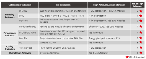 LONGi’s performance in three indicators of reliability, performance and quality identified it as one of only three companies to achieve the award. The company also became the only module manufacturer to perform well in all 8 individual tests, underlining the high reliability and excellent performance of its monocrystalline modules.