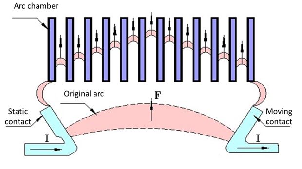 As it reaches the arc chute, the structure of the arc chutes widens the arc further and split it into small segments. This increases the length of the arc. It then cools down and eventually gets extinguished (as shown in Figure below).