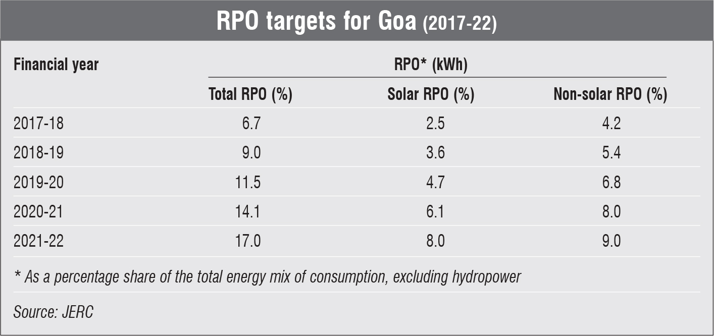 In addition to meeting the growing demand for power, the state aims to increase the share of renewable energy sources in the energy mix and meet renewable purchase obligations (RPOs). On the basis of reports submitted by the electricity department of Goa, the Joint Electricity Regulatory Commission (JERC) observed that while the state had achieved its solar RPO target for financial year 2019-20, it had a shortfall of 43.4 MU in achieving its non-solar RPO targets. The total RPO target to be met for financial year 2019-20 was 11.5 per cent, of which 4.7 per cent was the solar target. In order to comply with the non-solar RPO targets, the state’s electricity department had signed a letter of intent (LoI) with Manikaran Power Limited for the supply of non-solar renewable power and another LoI under a short-term open access agreement with Tata Power Trading Company Limited. As per the action plan submitted by the electricity department, the state planned to generate 2 MUs through solar projects and 0.61 MUs through non-solar renewable sources. Meanwhile, the total RPO targets for financial years 2020-21 and 2021-22 are 14.1 per cent and 17 per cent, respectively, and the solar component of the targets for these years are set at 6.1 per cent, and 8 per cent, respectively.