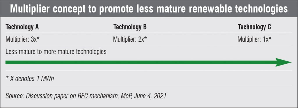 Regarding the objective of promoting new clean energy technologies, which face the issue of high upfront costs, a concept of different multipliers has been suggested to decide the number of RECs that will be applicable per MWh. Under this concept, a higher multiplier will be applicable to less mature technologies vis-à-vis mature technologies. Depending on the type of technology, the number of RECs that will be applicable are shown in the accompanying table.
