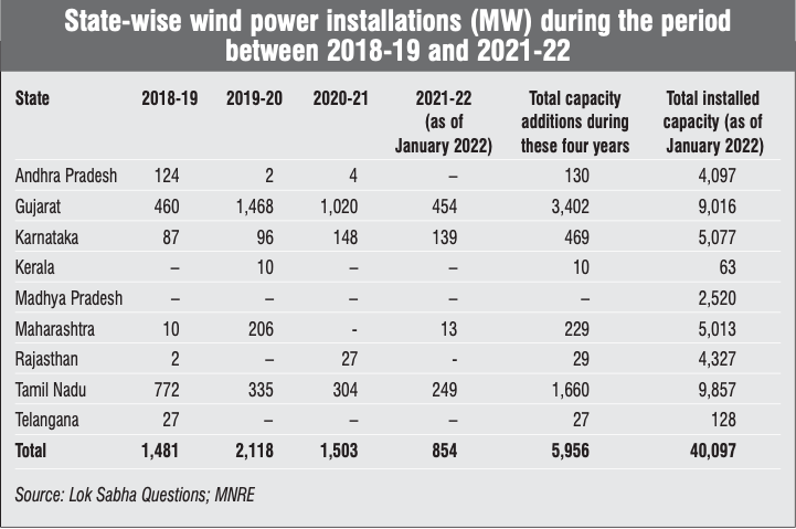 Karnataka’s 5,077 MW of installed capacity is quite small when compared to that of Tamil Nadu and Gujarat. Further, the state saw just 469 MW of new installations in the past four years. However, there have been several developments in the state in terms of not just project announcements but also in the policy space, which are expected to increase the installed wind capacity significantly in the coming months. In October 2021, Karnataka Renewable Energy Development Limited reissued the draft Karnataka Renewable Energy Policy, 2021-26, to develop 10 GW of renewable energy projects including stand-alone wind and wind-solar hybrid projects. Further, the policy allows for 4 acres of land per wind turbine generator.