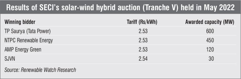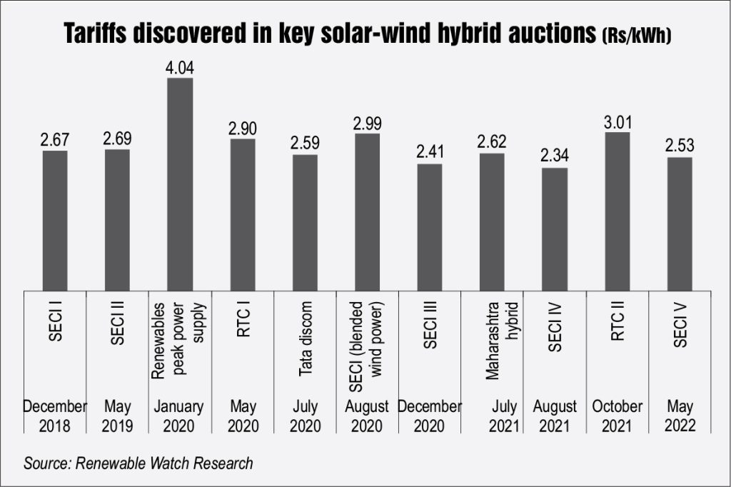 These policy interventions have provided the much-needed confidence to developers for setting up hybrid and RTC power supply projects. Many hybrid power-based auctions have been conducted. Most of them have been highly successful with competitive tariffs, while a few have witnessed a tepid response. Five tranches of solar-wind hybrid auctions have been conducted by the Solar Energy Corporation of India (SECI). The fifth one was held in May 2022 in which the lowest tariff discovered was Rs 2.53 per kWh. This tariff is quite high compared to the Rs 2.34 per kWh achieved in the fourth auction in August 2021. The higher tariff is attributed to supply chain issues, high commodity prices and import duties on solar modules, and may increase further in case of more upheavals.