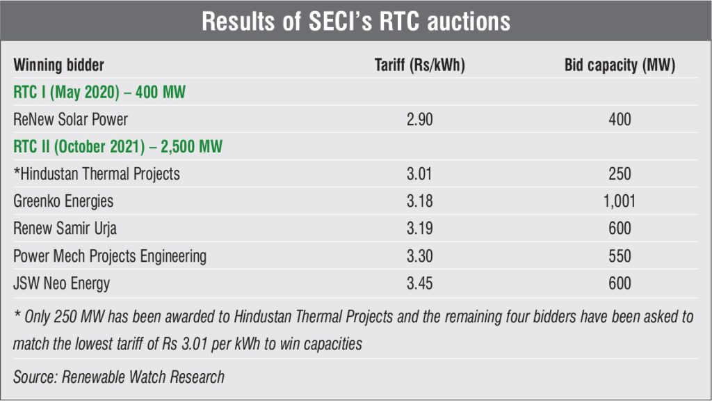 In October 2021, SECI announced the results of its second RTC auction. The tender was launched in March 2020, originally for the delivery of 5 GW of RTC power from grid-connected renewable power projects, coupled with power from coal-based thermal projects. In August 2020, SECI issued amendments to the tender documents wherein the capacity was halved to 2.5 GW. Among other amendments, bidders could tie up any amount of non-renewable power capacity. In the reverse auction, Hindustan Thermal Projects emerged as the single winning bidder, quoting the lowest tariff of Rs 3.01 per kWh (L1 tariff), and was awarded 250 MW of capacity.