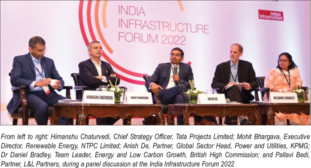 Economies across the world are focusing on accelerating clean energy transition. While renewables have grown apace in the past few years, the recent Russia-Ukraine war and its impact on global energy prices has led countries to lay greater emphasis on energy security, particularly utilisation of locally available renewable resources. India, which has an installed renewable energy capacity of 158 GW, is also aiming to reach 500 GW by 2030, but the road to meet the target is glutted with challenges as well as opportunities. At a recent panel discussion at the India Infrastructure Forum on May 11-12, 2022 in New Delhi, Mohit Bhargava, executive director, Renewable Energy, NTPC Limited; Dr Daniel Bradley, team leader, energy and low carbon growth, British High Commission; Pallavi Bedi, partner, L&L Partners; Himanshu Chaturvedi, Chief strategy officer, Tata Projects Limited; and Anish De, partner, global sector head, power and utilities, KPMG, deliberated on various opportunities and challenges in India’s clean energy transition. Renewable Watch presents a summary of the discussion…