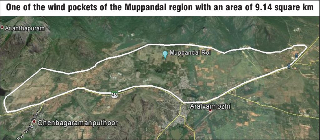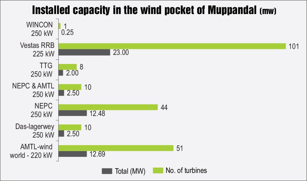 In a preliminary research analysis carried out for the assessment of the repowering potential, Muppandal in the Kanyakumari district of Tamil Nadu was taken as a suitable example to understand how repowering could add to the existing installed capacity, while considering the trade-off between the performance of wind turbines and land utilisation per megawatt of capacity installed. Muppandal is regarded as one of the oldest wind pockets of the country as it uses first-generation WTGs, which have completed 20 years.