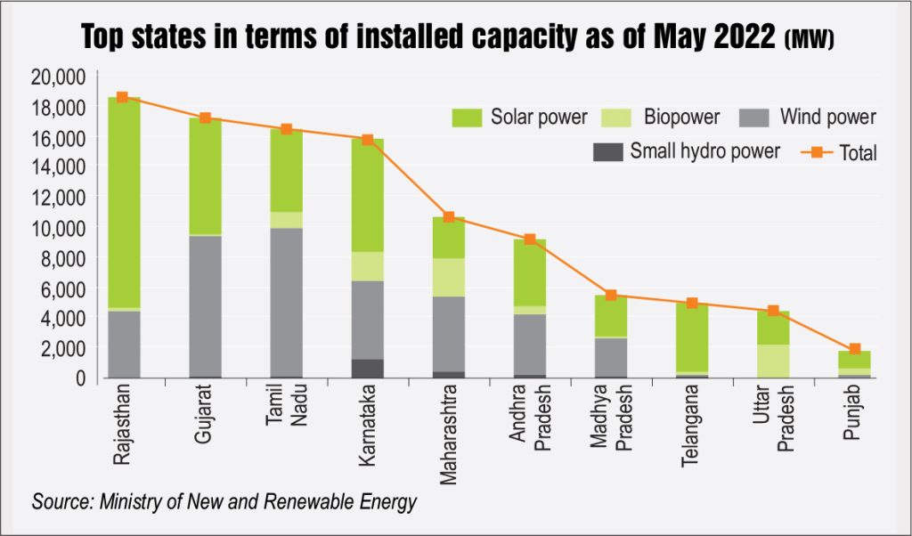 Since the beginning of 2022, Rajasthan has witnessed significant project activity with the commissioning of large renewable energy assets such as Brookfield Renewable India’s 450 MWDC solar project, ACME’s 300 MW solar project, Tata Power Solar’s 160 MWAC project, Azure Power’s 300 MW solar project and Adani Green Energy Limited’s 390 MW wind-solar hybrid project. These recent projects completed over the past five to six months have been responsible for increasing the state’s total installed renewable energy capacity to 18,707 MW as of May 2022.