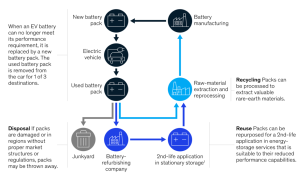 - Reusing: This involves splitting of the battery down to the cell or pack level post which the individual cells or packs are reused directly in a wide variety of applications