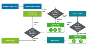 Post diagnosis, method of reuse to be adopted depends on the Remaining Useful Life (RUL), State of Health (SoH), specific reparation costs and safety conditions. A decision tree analysis is done based on the custom classification and grading process employed by different companies to decide between reconditioning/refurbishing/repurposing/reuse.