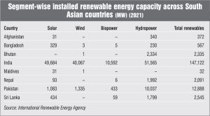 Other countries such as Afghanistan, Bhutan, Maldives and Nepal have witnessed slow growth of renewables. While Maldives is working on setting up microgrids and small-scale solar projects, the much larger Afghanistan has vast potential for solar, which remains unexplored. Geopolitical tensions in Afghanistan due to the Taliban’s rule are expected to derail the country’s efforts in the renewable energy space. Recently, India decided to import solar energy from Nepal, which will also join the International Solar Alliance, which is led by India. In addition, the participation of Indian firms in Nepal-based hydropower projects is also expected to increase, going forward.