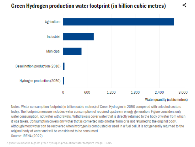 For a just GH2transition, we need to carefully manage resources and make sure the benefits are shared fairly. For example, areas with abundant solar energy potential are often arid and prone to water stress. The production of GH2 depends on water for electrolysis, even if the amounts needed are comparatively small (see chart below).