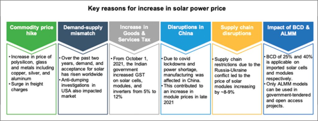 Solar power tariff had dropped to an all-time low of Rs 1.99 per unit, as discovered during the 500 MW capacity auction by Gujarat Urja Vikas Nigam Ltd (GUVNL), in December 2020. The imposition of a 25 per cent basic customs duty (BCD) on solar cells and 40 per cent on modules was expected to increase tariffs significantly. However, the discovery of a tariff of Rs 2.20 per unit in March 2021 came as a relief to states. A host of Covid-related uncertainties, a surge in commodity prices, the notification of the Approved List of Models and Manufacturers (ALMM), and the increase in GST of 12 per cent have led to a further rise in tariffs. An appropriate indicator would be the Rs. 2.49 per unit discovered in September 2022, during GUVNL’s 750 MW solar auction.
