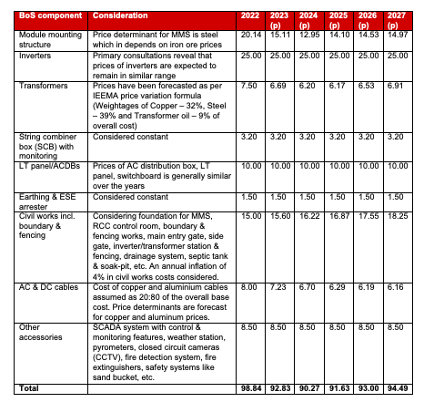 The overall cost of BoS shall be driven by the prices of the individual materials that go into the manufacturing of its various components. With highly competitive bidding in auctions, developer margins are being squeezed, leading to a focus on BoS costs to reduce capital costs. It has been observed over the years that as the prices of commodities have increased, developers have opted for optimisation measures in the use of components to keep BoS costs within a particular price range. Along with year-on-year technological advancements that drive down the prices of components such as inverters, there is the use of substitutes in order to optimise BoS costs.