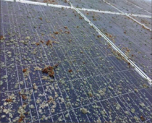 Solar arrays are exposed to both sunlight and water, which facilitate the growth of lichen. Nutrients such as nitrogen and ammonia speed up growth, especially as bird droppings are rich in nitrogen. The lifetime of a panel as well as its output and performance are known to be reduced as a result of such staining, which is also known to result in persistent module shadowing.