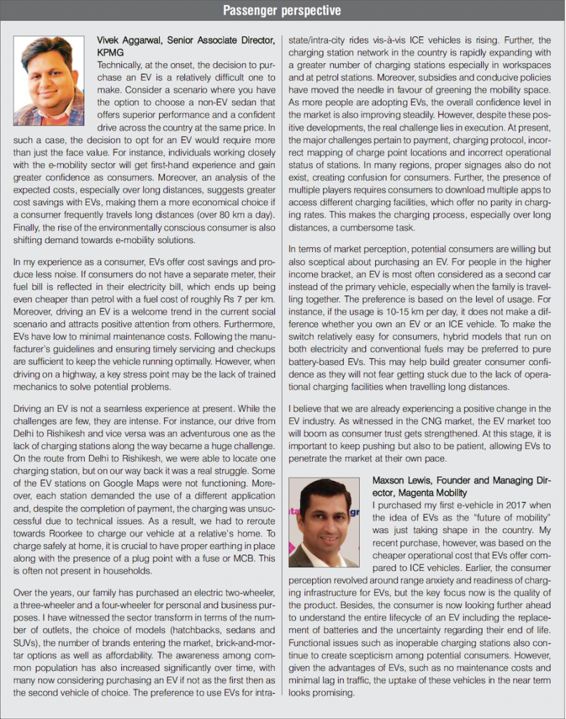 There is little doubt that the EV market is poised to take off in a big way in India, although consumer responsiveness suggests otherwise. According Deloitte’s 2023 Global Automotive Consumer Study, the top five reasons that consumers opt for EVs are lower costs, improved driving experience, minimal maintenance requirement, use of the vehicle as a power source and concerns regarding climate change, in order of importance. Currently, Indian EV consumers prioritise costs and operational advantages over environmental considerations. This places a greater responsibility on EV manufacturers and service providers to meet consumer expectations and drive increa