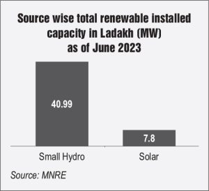 In 2011, the NHPC Ltd. commissioned the Nimoo Bazgo hydroelectric project (HEP). It is a significant hydropower project located on the Indus river near Leh. It was constructed in 2011 and has been an integral player in Ladakh’s renewable energy landscape. This facility, with a capacity of 45 MW, has significantly contributed to the region’s power supply while minimising its carbon footprint. Another significant project is the 44 MW Chutak hydropower project, situated along the Suru river in Kargil district. However, no other project of this scale has been developed since. The challenging geological makeup of the area is unfavourable for building bigger projects, making small-hydro power projects the most suitable means for realising Ladakh’s hydropower potential. At present, small-hydro projects account for over 84 per cent of the total installed renewable energy capacity in Ladakh, amounting to roughly 41 MW.
