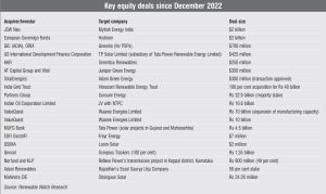 With 19 deals (according to Renewable Watch Research), the equity/mergers and acquisitions market remained active during the past year. The biggest equity deal of the year was the acquisition of 30 Mytrah Energy special purpose vehicles (SPVs) with 1,753 MW of renewable energy generation capacity by JSW Energy. The acquisition was valued at around Rs 101.5 billion. JSW Energy’s JSW Neo completed the acquisition in two stages, purchasing a total of 1,449 MW of installed renewable energy capacity across Mytrah Energy’s 15 SPVs and 13 ancillary SPVs. These 28 subsidiaries of Mytrah Energy have now become subsidiaries of JSW Neo and JSW Energy. JSW Neo infused optional convertible debentures, with the right to convert them into equity, in the other two SPVs with 304 MW of renewable energy assets between them, and executed forward sale agreements with them. Mytrah’s 1,753 MW portfolio includes 1,331 MW of wind capacity and 422 MW (487 MWp DC) of solar capacity, located primarily in India’s south, west and centre. The assets are covered by long-term power purchase agreements with an average remaining life of 17 years.