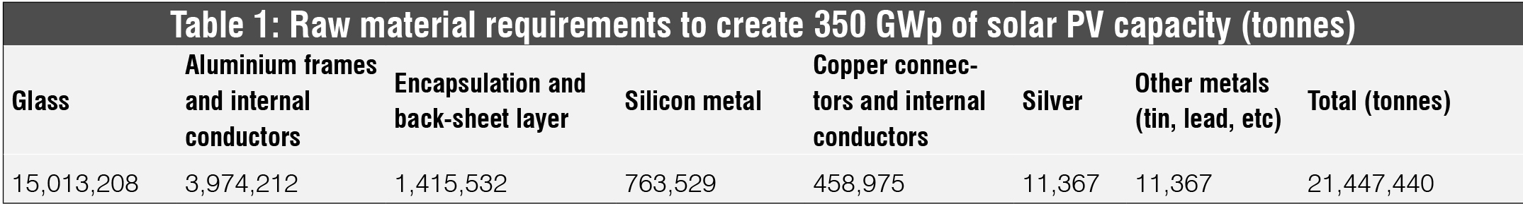 The glass used in a typical crystalline solar PV module has antimony, and the solder paste used to interconnect the cells contains lead. The quantities of these hazardous materials are below the threshold limits for causing environmental damage. Table 1 shows the anticipated raw material requirement using crystalline solar cells under the business-as-usual scenario of 350 GWp of solar PV capacity, as per research done by Malaviya Solar Energy Consultancy. The data was arrived at with consideration of the anticipated evolution of the weight of PV modules until 2030, and market projections.