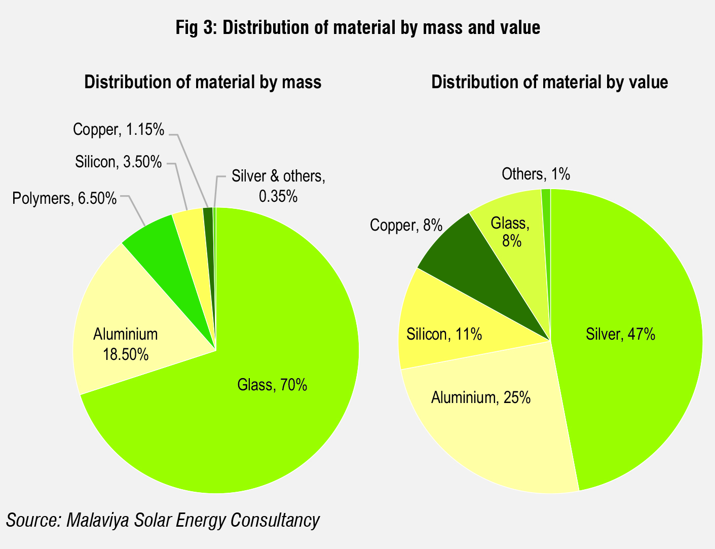 Glass is the heaviest component (70 per cent by mass), but it contributes only 8 per cent of the value of the solar PV module chain. By contrast, silver is less than 0.1 per cent by weight but valued at 47 per cent. In fact, the recovery of silver will be the driver for the recycling of solar modules. Fig 3 shows the distribution of materials by mass and value.