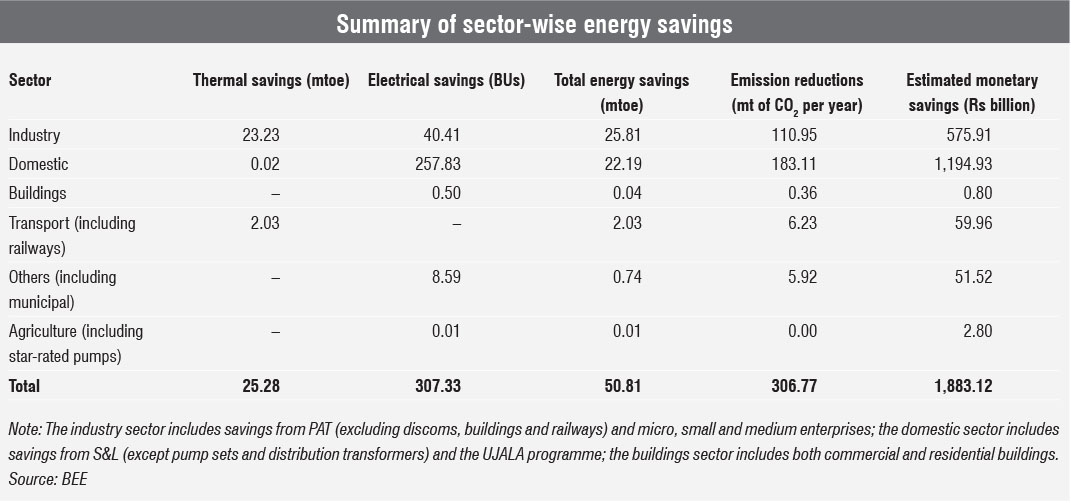 These measures have resulted in total annual energy savings of around 51 mtoe, which is 6.6 per cent of the country’s total primary energy supply. This also equates to annual cost savings of approximately Rs 1,943.2 billion and a reduction of around 306 MtCO2e.