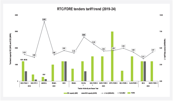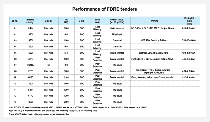 The first competitive bid tender for the RTC concept was released by Solar Energy Corporation of India Limited (SECI) in 2018, where the requirement was to supply 400 MW of renewable power at an 80 per cent annual capacity utilisation factor (CUF) while also meeting a monthly CUF of 70 per cent, with penalties in place for not doing so. ReNew won that tender at a first-year tariff of Rs 2.9 per kWh. The project is being readied for commissioning at the time of writing. Since then, under the aegis of RTC, various tender nodal agencies have issued 24 such tenders, of which 11 are in various stages of execution, five are in the open tendering stage and eight stand cancelled. Through the years, a lot of combinations have been tried in this domain, including thermal plus renewables, which unfortunately did not find traction amongst developers. The initial tenders, apart from three that were modelled on renewable plus thermal, majorly focused on peak availability – initially with a two-part tariff (peak and off-peak) structure, which was eventually replaced with a single tariff requirement. The tariffs discovered in these tenders hovered around Rs 4.5 per kWh. Finally, in 2023, the concept of RTC was amended to the more holistic and well-defined one of firm and despatchable renewables (FDRE). As of August 2024, 13 (16.4 GW), FDRE tenders have been issued by various nodal agencies, of which five (3.8 GW) are at the open tendering stage, four (4.8 GW) have been awarded, one (1.2 GW) is under execution and three (4.6 GW) have