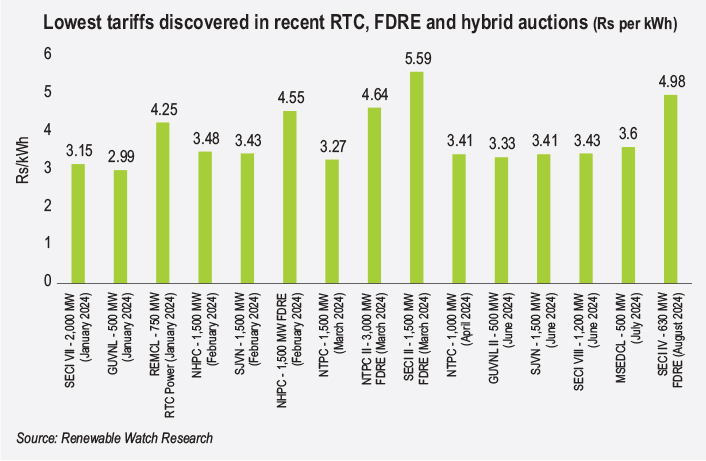 Since January 2024, several FDRE auctions have been conducted by NTPC Limited, SECI and NHPC Limited, where the L1 tariff ranged from Rs 4.55-Rs 5.59 per kWh. The tender name and lowest tariffs have been mentioned in the graph.