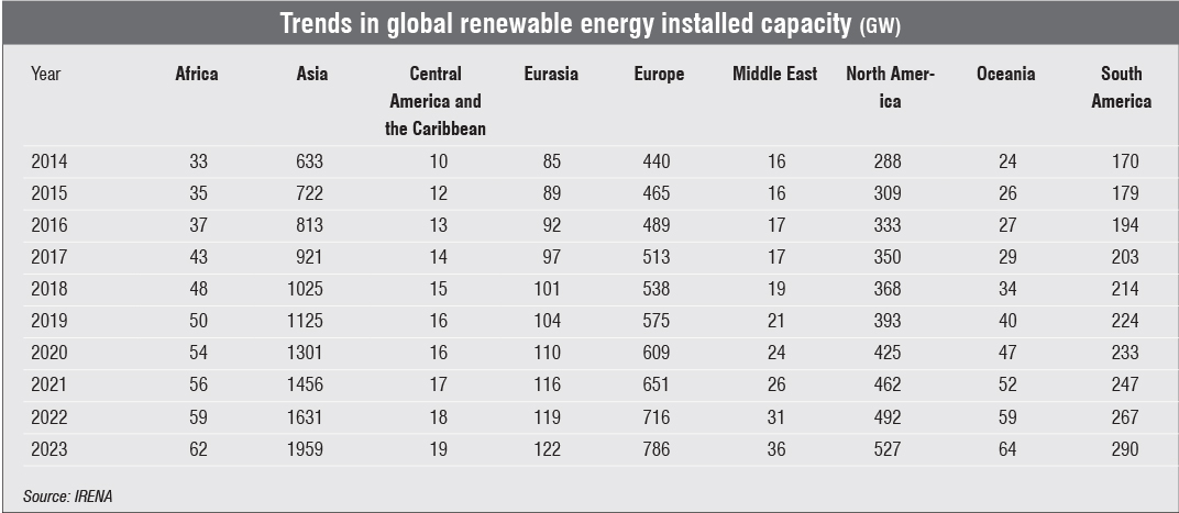 Globally, renewable energy now commands the largest share of power generation, with countries such as Brazil and China leading in hydroelectric and solar production respectively. This growth is mirrored by Asia’s impressive expansion in renewable energy capacity, as highlighted by the International Renewable Energy Agency (IRENA), which has shown an increase from 633 GW in 2014 to 1,959 GW in 2023. While Europe and North America have made steady progress, Africa and the Middle East continue to lag, reflecting the uneven pace of transition across regions. This disparity is further underscored by the IEA’s World Energy Investment 2024 report, which forecasts global energy investments exceeding $3 trillion for the first time, with two-thirds allocated to clean energy. However, only 15 per cent of this investment flows to emerging markets outside China, highlighting the persistent inequities in the global energy transition.