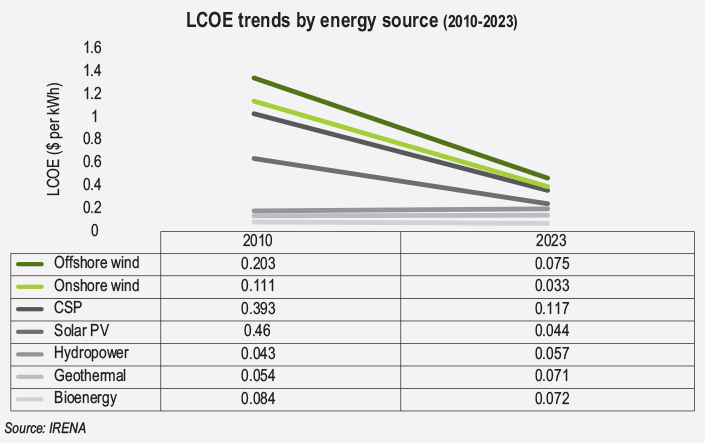 Global investment in renewables surged by 20 per cent in 2023, reaching nearly $750 billion, equivalent to 1 per cent of the global GDP. Simultaneously, the total supply of modern renewables rose by 5 per cent year-on-year to almost 78 Joules (2.16 × 107 GWh), contributing 12 per cent to the global energy supply (IEA 2024). This growth reflects the phrase, “a rising tide lifts all boats,” as declining costs continue to enhance global competitiveness for the sector. In 2023, utility-scale solar photovoltaic project costs fell by 12 per cent, while onshore and offshore wind saw cost reductions of 3 per cent and 7 per cent respectively, according to IRENA’s Renewable Energy Production Costs Report. Battery storage costs have also plummeted by 89 per cent since 2010, reflecting significant advancements. As a result, compared to fossil fuels, solar PV and onshore wind are now 56 per cent and 67 per cent cheaper, respectively, marking a transformative shift from 2010 when solar PV was 414 per cent more expensive and wind was 23 per cent costlier.