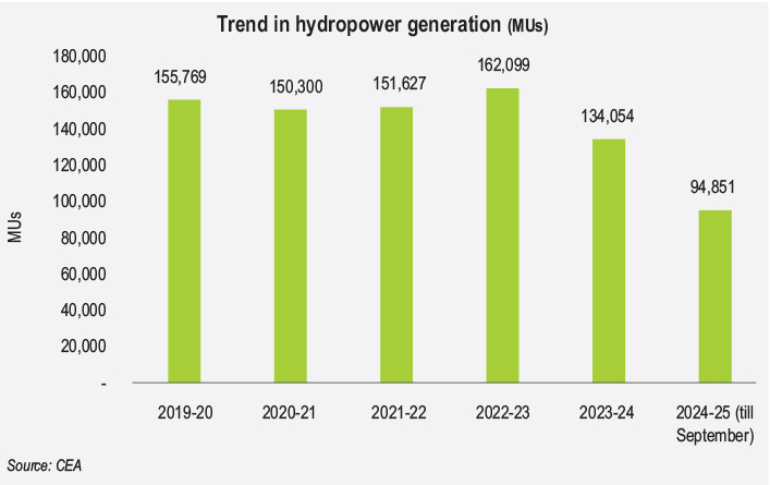 Furthermore, erratic rainfall and natural disasters led to a 17.76 per cent drop in hydropower generation, reducing its contribution in the energy mix from 11 per cent to 9 per cent. However, in 2024-25 (as of September 2024), the contribution of hydropower in the total power generation has increased to 11.6 per cent, as per CEA data.